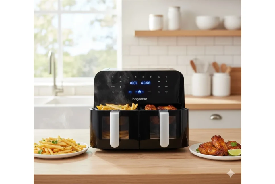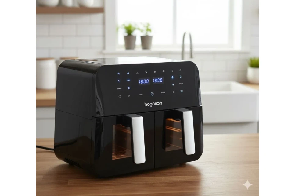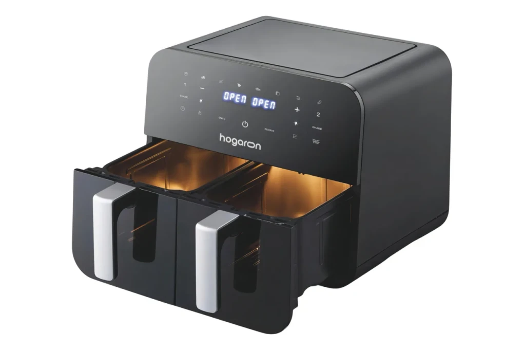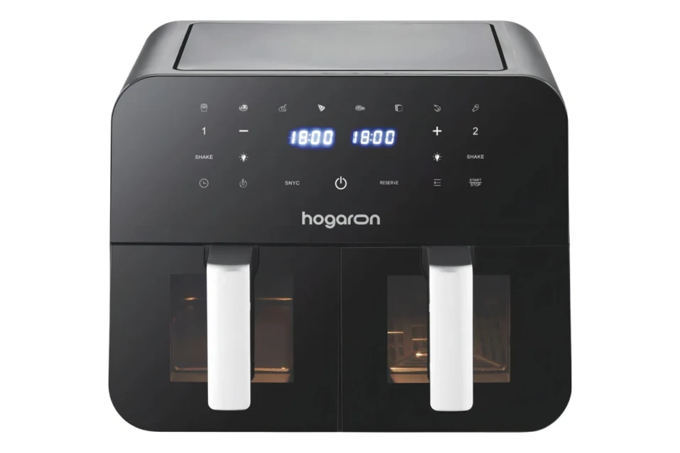Detalles Técnicos -Potencia 2400W -Capacidad 9L (4,5; 4,5L) -Doble canasto permite cocinar simultáneamente dos platos diferentes -Cocina saludable, menos grasa -Fácil de limpiar -Versatilidad total -Ventana visible -8 programas preestablecidos -Panel digital -Tecnología de circulación de aire 360° -Protección contra sobrecalentamiento -Con función de calentamiento Capacidad y doble funcionalidad La HOGARON de 9 litros está diseñada para cocinar más en menos tiempo gracias a sus dos canastos de 4,5L cada uno, que permiten preparar simultáneamente dos platos diferentes sin mezclar sabores. Ideal para familias numerosas o para quienes disfrutan de la practicidad al cocinar. Cocina saludable y eficiente Con su tecnología de circulación de aire 360°, logra una cocción uniforme con hasta un 90% menos de grasa que los métodos tradicionales, manteniendo el sabor y la textura crujiente de los alimentos. Sus 8 programas preestablecidos hacen que preparar carnes, papas fritas, vegetales o postres sea tan sencillo como presionar un botón. Diseño moderno y seguro Equipada con panel digital, ventana visible y función de calentamiento, esta freidora ofrece control total sobre tus preparaciones. Además, cuenta con protección contra sobrecalentamiento para un uso seguro y está pensada para ser fácil de limpiar después de cada uso.