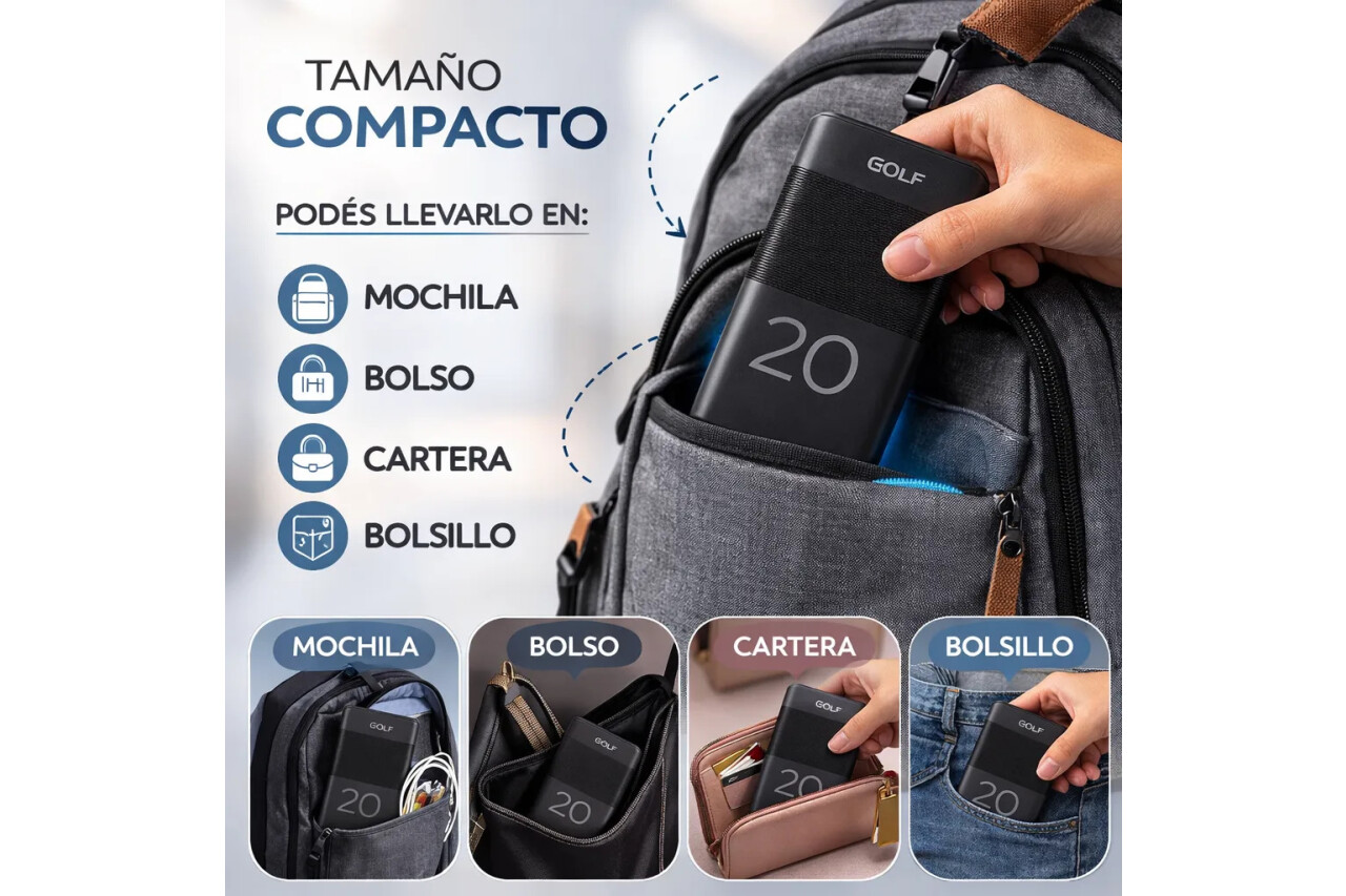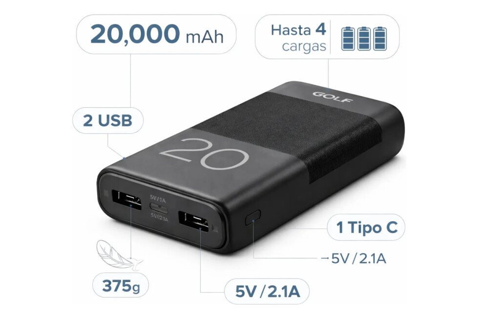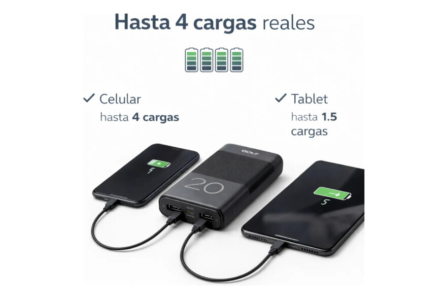 Power Bank 20.000 mAh – Energía Real Cuando Más La Necesitás Quedarte sin batería ya no es una opción. Con 20.000 mAh reales, este power bank te acompaña todo el día, en el trabajo, viajes o situaciones imprevistas. Máxima Autonomía Hasta 4–6 cargas para smartphones promedio Ideal para jornadas largas fuera de casa Perfecto para viajes, oficina y uso diario Cargá Múltiples Dispositivos al Mismo Tiempo 2 Puertos USB (5V / 1A y 5V / 2.1A) 1 Puerto Tipo C (entrada y salida 5V / 2.1A) Compatible con smartphones, auriculares, smartwatches y más Tecnología Segura y Estable Batería de polímero de alta densidad Mayor estabilidad y seguridad frente a baterías tradicionales Rendimiento confiable y duradero Diseño Funcional y Resistente Tamaño compacto: 68 x 28 x 136,5 mm Peso: 375 g Construcción sólida para uso diario Ideal Para: Personas que usan intensivamente su celular Estudiantes y trabajadores móviles Viajeros frecuentes Quienes necesitan respaldo energético constante Especificaciones Técnicas Capacidad: 20.000 mAh Entrada Tipo C: 5V / 2.1A (Máx) Salida Tipo C: 5V / 2.1A (Máx) Salida USB 1: 5V / 1A Salida USB 2: 5V / 2.1A Invertí en autonomía real. No dependas más de enchufes ni te quedes incomunicado cuando más lo necesitás. Garantía del vendedor: 1 meses