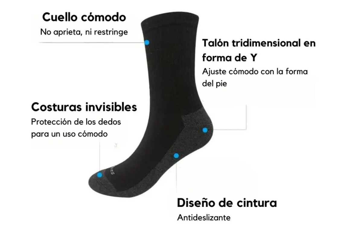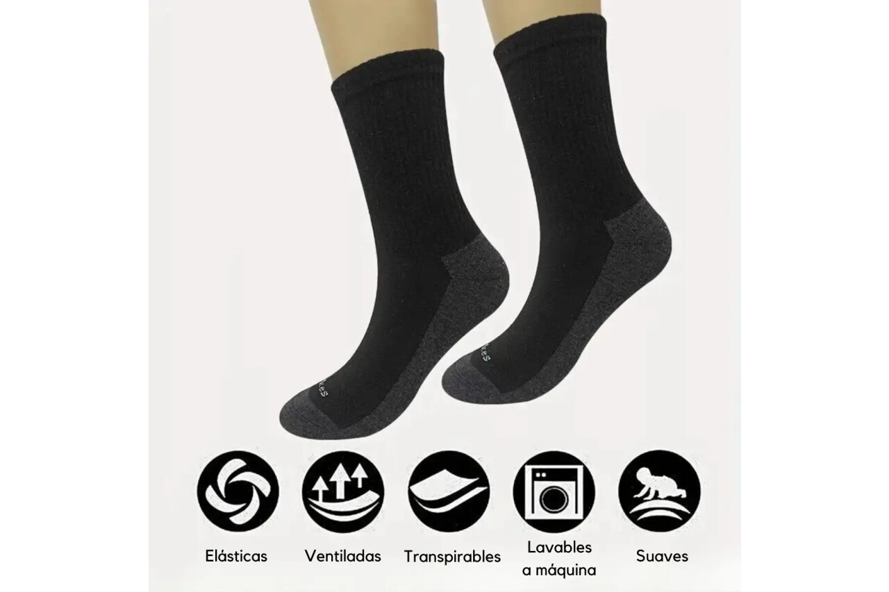 Medias Deportivas y De Trabajo Descubre nuestras Medias trabajo y/o deportivas en tonos negros y blancos, diseñadas especialmente para brindarte la comodidad y soporte que necesitas, tanto en tus rutinas deportivas como en tus actividades diarias. Material Transpirable: Confeccionadas con un tejido que permite la circulación del aire, garantizando que tus pies se mantengan frescos y secos durante largas jornadas, ya sea haciendo ejercicio o trabajando. Diseño ajustable: Se ajustan con firmeza a tus pies, evitando deslizamientos y ofreciendo una sujeción que te permite moverte con confianza. Colores Versátiles: Disponibles en clásicos negro y blanco, se adaptan a cualquier outfit, lo que las convierte en una opción versátil para el gimnasio, el parque o incluso para el uso diario. Ideales para todo tipo de actividades: deportes, caminatas largas o simplemente para un día en la oficina. Cuidados: Nuestras medias son fáciles de cuidar. Se recomienda lavarlas a mano o en máquina en un ciclo suave para preservar su calidad y color. Talle único. Medidas: Base de pie: De 22cm a 31cm Alto/largo: 12cm (tomado hasta tobillo) 7cm (talón a tobillo) Dato importante: Los packs son X6 pares de medias de un solo color o pack X3 de 3 pares negros y 3 blancos. EXCELENTE CALIDAD, NO SE LO PIERDA! PICK UP CENTER: Brazo Oriental- Proximidad Burgués entre Pablo Erlich y Roberto Koch, de lunes a viernes de 9 a 18hs, sábados de 9 a 13hs. INTERIOR: Si selecciona a través de Mercado envío se despachará en Agencia asignada por Mercado Libre en el día o puede acordar para envío en agencia de su preferencia ingresando los datos correctos incluyendo localidad y teléfono, abonando el correspondiente envío al recibir. COMPROBANTE: En caso de necesitar Factura con RUT enviar por mensaje los siguientes datos: nombre de la razón Social, N° de RUT, dirección y tel/celular. En caso contrario se realizará a Consumidor final. Puede realizar todas las consultas que crea necesarias antes de comprar. Equipo PIKE STORE IMPORTACIONES