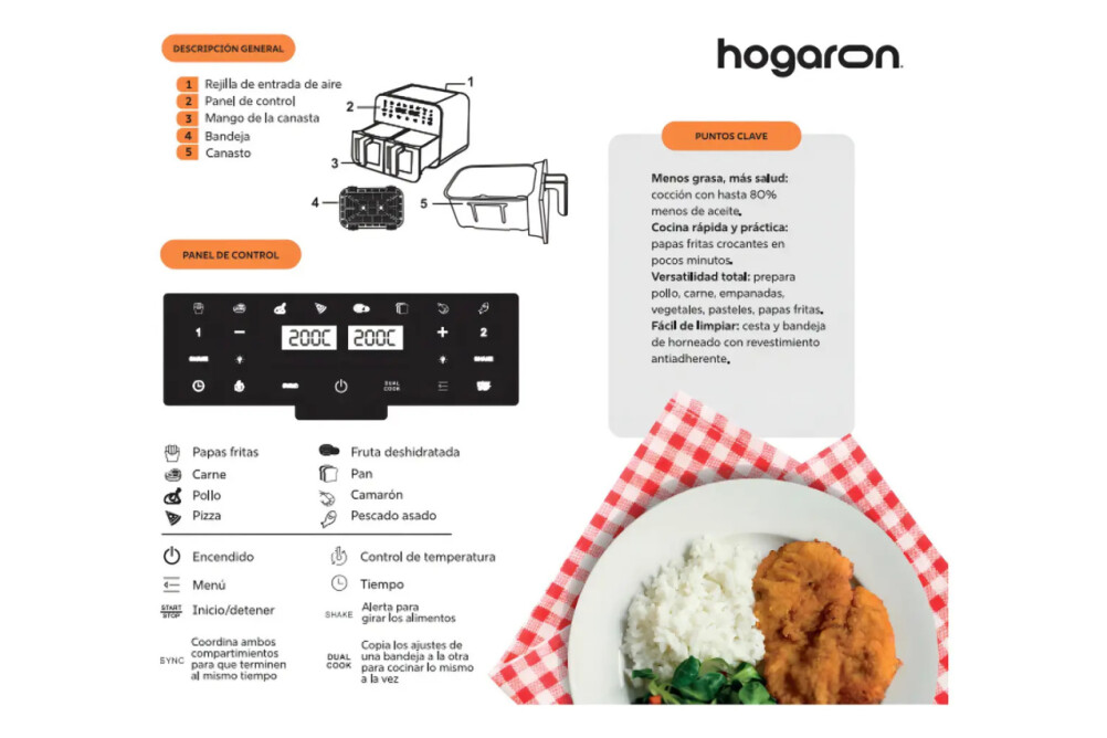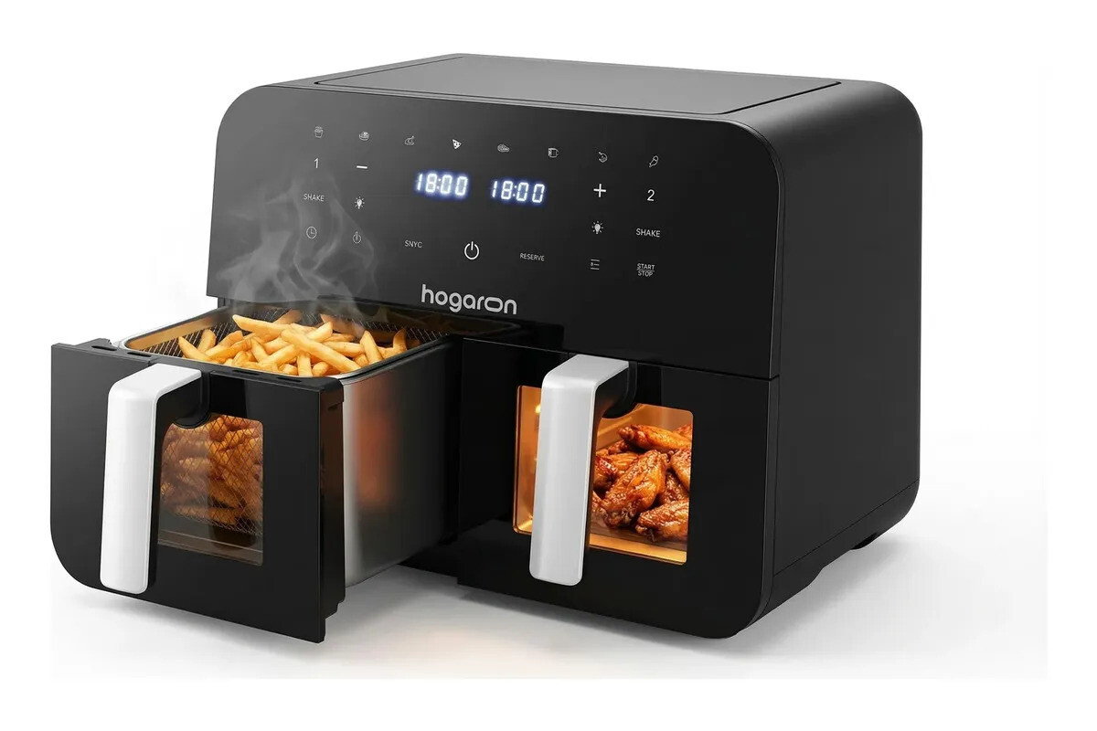 FREIDORA DE AIRE HOGARON 9L - DOBLE CANASTO CON VISOR DIGITAL ¿Necesitás cocinar dos platos distintos al mismo tiempo? Con la Hogaron de 9 LITROS Dual, podés hacer las papas fritas en un canasto y el pollo en el otro, terminando ambos al mismo tiempo. Es la solución definitiva para familias grandes y para quienes buscan versatilidad total. LO QUE LA HACE DIFERENTE: - DOBLE CANASTO INDEPENDIENTE: Dos zonas de cocción separadas para preparar comidas diferentes sin mezclar sabores. - CAPACIDAD TOTAL 9L: Gran espacio dividido en dos canastos, ideal para familias numerosas o cenas con amigos. - POTENCIA MAXIMA 2400W: Una de las más potentes del mercado para garantizar que ambos canastos cocinen a la perfección. - VENTANAS VISIBLES DUALES: Mirá el progreso de cada canasto de forma independiente sin abrir las gavetas. - PANEL DIGITAL LCD: Control táctil independiente para cada zona de cocción con 8 programas automáticos. DETALLES TÉCNICOS: - Potencia: 2400W (Máximo rendimiento dual). - Capacidad Total: 9 Litros (Divididos en dos canastos). - Temperatura ajustable: 80 a 200 grados en cada zona. - Tecnología de circulación de aire 360 grados. - Visores: Dos ventanas de vidrio templado con luz interna. - Seguridad: Mangos de toque frío y protección contra sobrecalentamiento. - Limpieza: Canastas con revestimiento antiadherente de alta calidad. - Función de sincronización: Para que ambas comidas terminen juntas. ¿QUÉ INCLUYE TU COMPRA? X1 Freidora de Aire Hogaron 9L Doble Canasto. X2 Canastas antiadherentes. X1 Manual de usuario con guía de cocción. ¡Llevá tu cocina al siguiente nivel con la potencia dual de Hogaron!