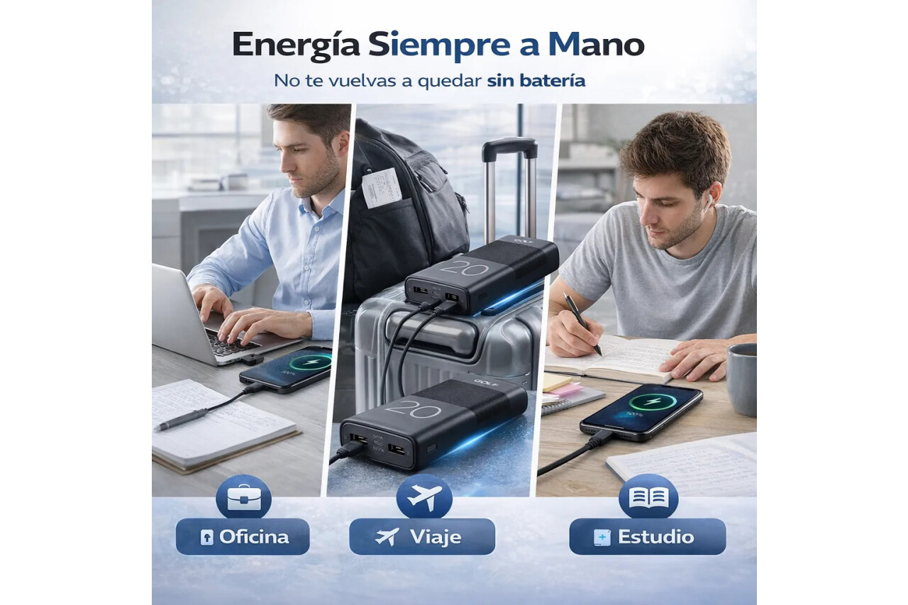Power Bank 20.000 mAh – Energía Real Cuando Más La Necesitás Quedarte sin batería ya no es una opción. Con 20.000 mAh reales, este power bank te acompaña todo el día, en el trabajo, viajes o situaciones imprevistas. Máxima Autonomía Hasta 4–6 cargas para smartphones promedio Ideal para jornadas largas fuera de casa Perfecto para viajes, oficina y uso diario Cargá Múltiples Dispositivos al Mismo Tiempo 2 Puertos USB (5V / 1A y 5V / 2.1A) 1 Puerto Tipo C (entrada y salida 5V / 2.1A) Compatible con smartphones, auriculares, smartwatches y más Tecnología Segura y Estable Batería de polímero de alta densidad Mayor estabilidad y seguridad frente a baterías tradicionales Rendimiento confiable y duradero Diseño Funcional y Resistente Tamaño compacto: 68 x 28 x 136,5 mm Peso: 375 g Construcción sólida para uso diario Ideal Para: Personas que usan intensivamente su celular Estudiantes y trabajadores móviles Viajeros frecuentes Quienes necesitan respaldo energético constante Especificaciones Técnicas Capacidad: 20.000 mAh Entrada Tipo C: 5V / 2.1A (Máx) Salida Tipo C: 5V / 2.1A (Máx) Salida USB 1: 5V / 1A Salida USB 2: 5V / 2.1A Invertí en autonomía real. No dependas más de enchufes ni te quedes incomunicado cuando más lo necesitás. Garantía del vendedor: 1 meses