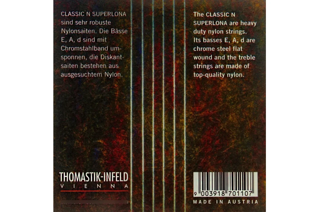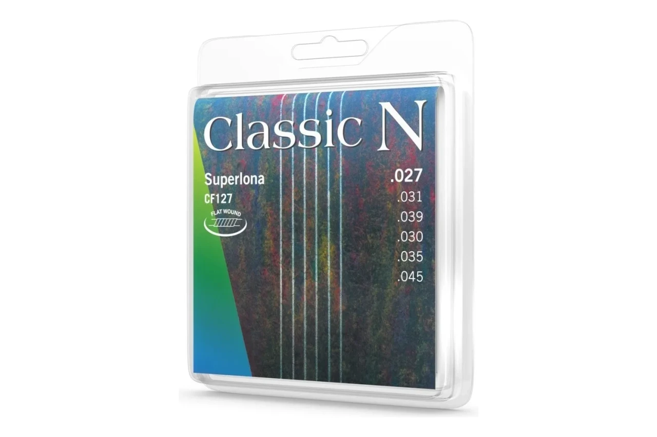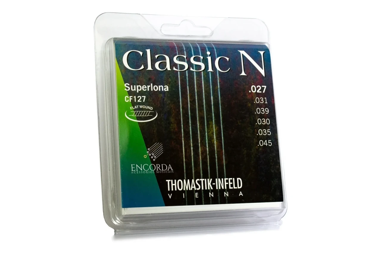 Jogo completo de 6 (seis) cordas para violão de nylon, Thomastik-Infeld Classic N Superlona Flatwound CF127 Tensão Média Composição das cordas: Cordas E1, B2 e G3 – nylon retificado, liso e transparente Cordas D4, A5 e E6 – núcleo de nylon multifilamentar com revestimento flat em cromo (flatwound) Calibre das cordas: E1 – 0,027” 6,9Kg B2 – 0,031” 5,5Kg G3 – 0,039” 5,6Kg D4 – 0,030” 6,5Kg A5 – 0,035” 6,4Kg E6 – 0,045” 6,4Kg Características: As cordas Thomastik-Infeld Classic N Superlona Flatwound CF127 possuem as três cordas agudas em nylon e os baixos com revestimento tipo flat em cromo. São macias e fáceis de tocar, não geram ruído ao trocar a posição da mão esquerda. Os baixos soam mais a nota fundamental e menos os harmônicos secundários. Indicadas para violões com captação e preferidas por músicos que executam repertório de MPB, samba e choro. Ideais para gravação devido ao baixo nível de ruído. As cordas Thomastik-Infeld são produzidas na Áustria desde 1919, reconhecidas pelo alto padrão de qualidade.